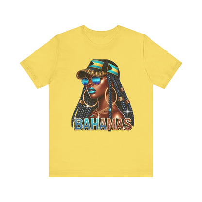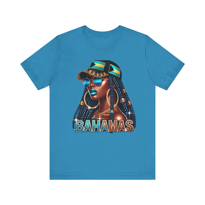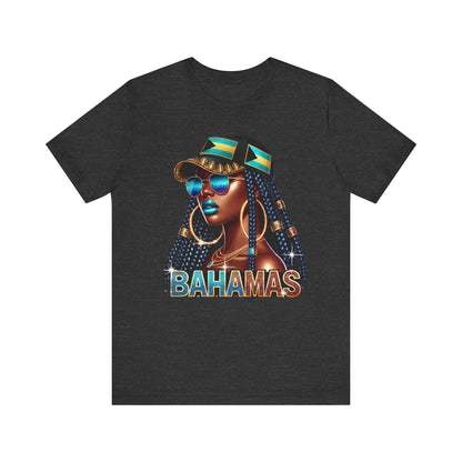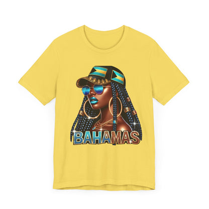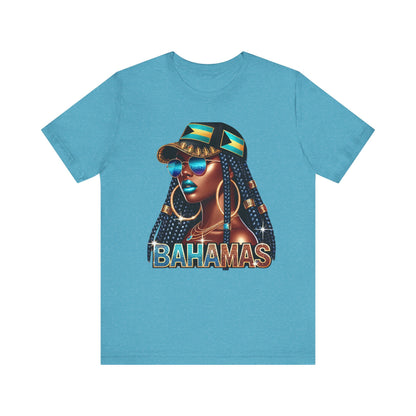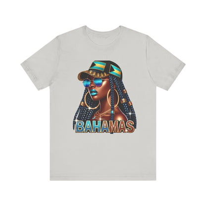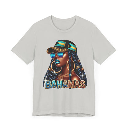 Celebrate your cultural heritage and personal style with our Bahamas Pride Women's Graphic T-Shirt, designed to reflect the vibrant spirit of the islands. Featuring an Afrocentric graphic of a bold female figure wearing a cap adorned with the Bahamian flag, this tee encapsulates island pride and Bahamian patriotism. The design is completed with stylish hoop earrings and striking sunglasses, while the word "BAHAMAS" stands out boldly below the artwork, making this t-shirt a meaningful addition to your wardrobe.