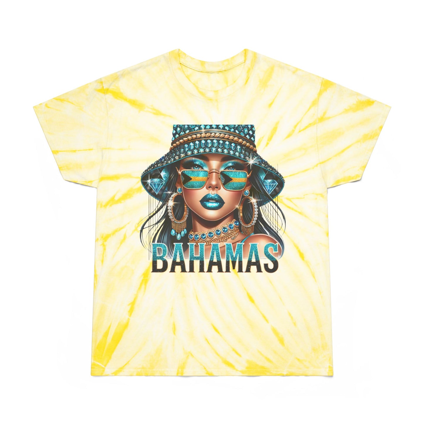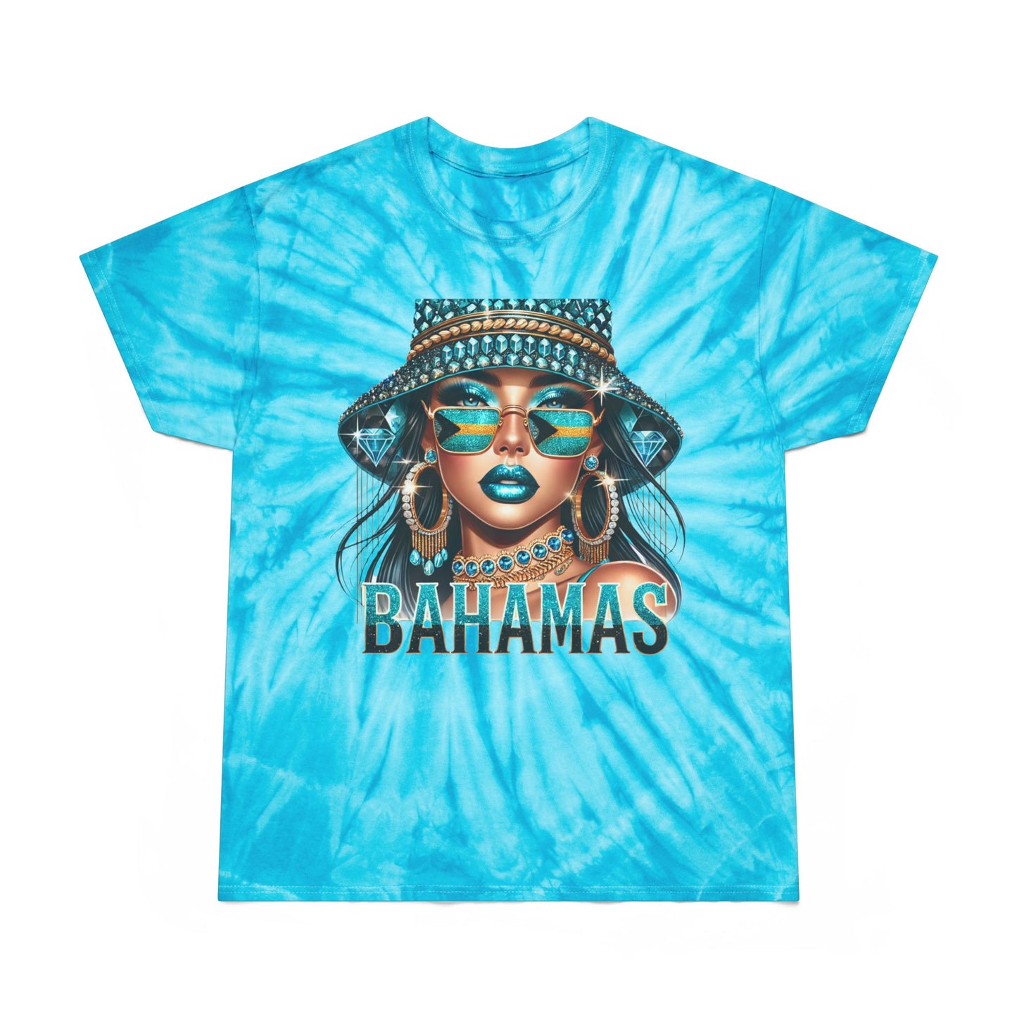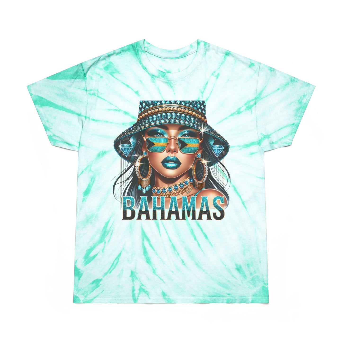 Elevate your style with our exclusive Bahamas pride apparel—a unique tie-dye t-shirt that effortlessly blends cultural heritage with modern fashion. This standout design features a bold graphic illustration of a female figure with textured hair styled in twin puffs, donning a cap proudly emblazoned with the Bahamian flag. Accented by statement hoop earrings and a chic pearl necklace, every detail in the design exudes island pride and patriotic spirit.