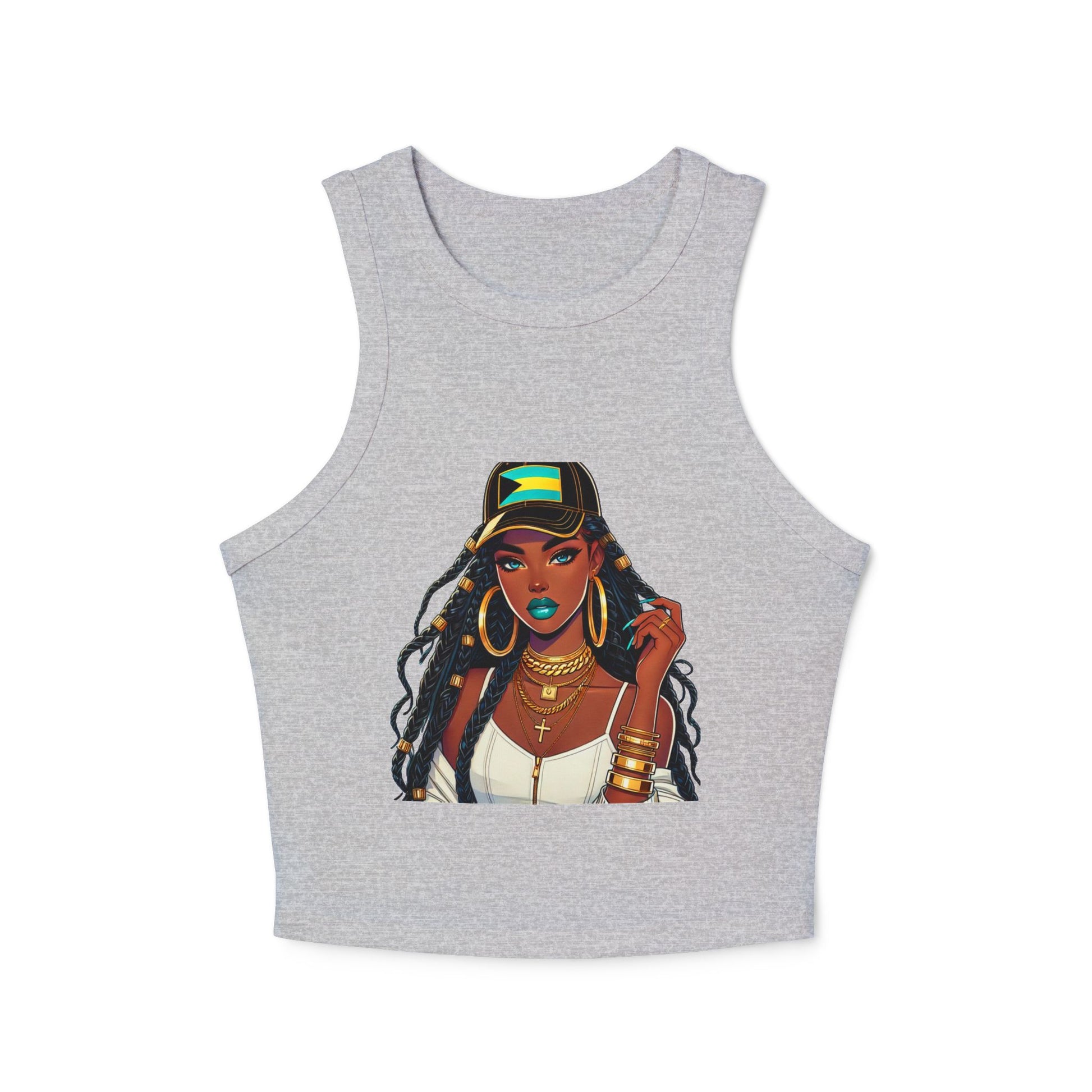 Introducing the Bahamas Women Racer Back Crop Tank Top, a stunning tribute to Bahamian pride and cultural heritage. This vibrant tank top is tailored specifically for the confident Bahamian woman who wishes to celebrate her roots in style. Featuring the bold colors of black, aquamarine, and gold, this tank top serves as a fashionable symbol of national pride, perfect for a variety of occasions—from lively Junkanoo celebrations to beach outings under the sun.