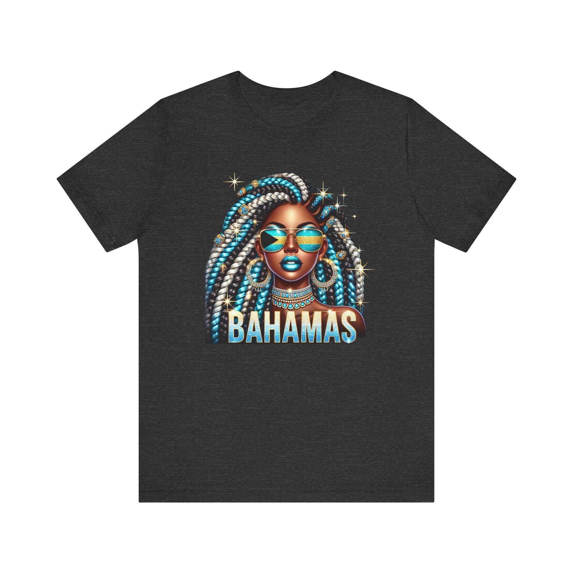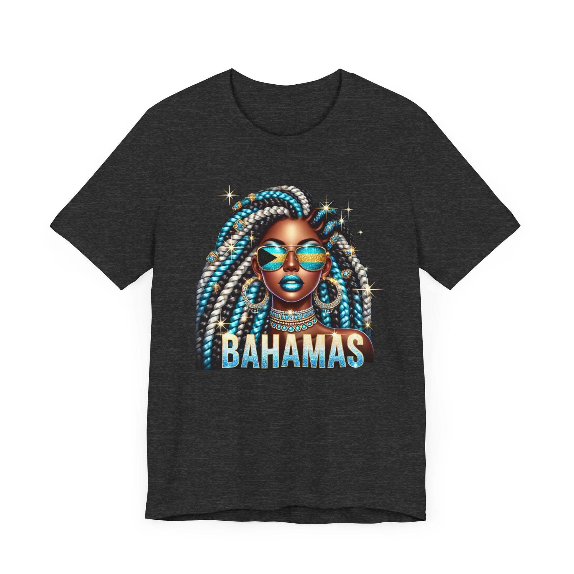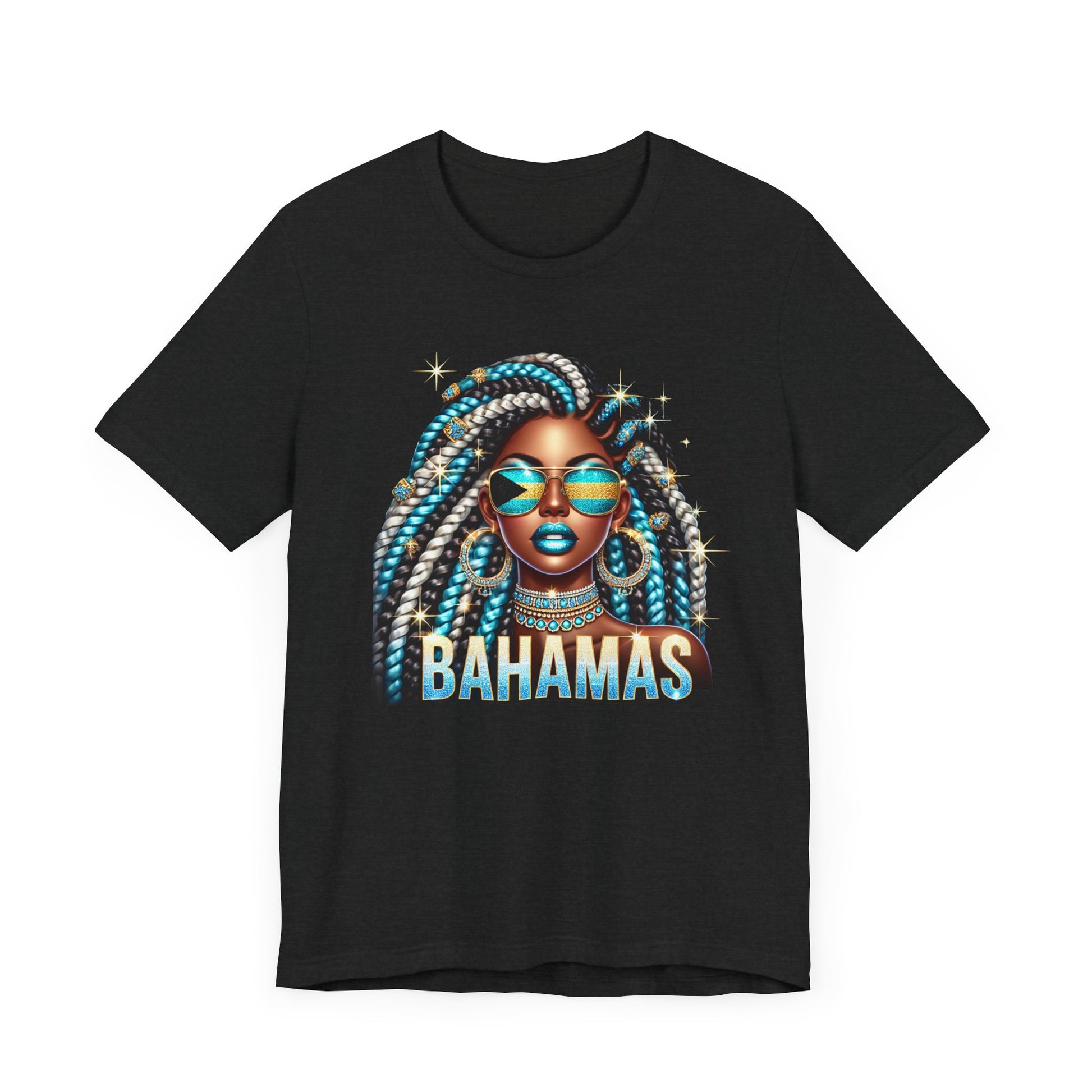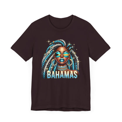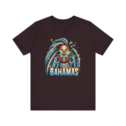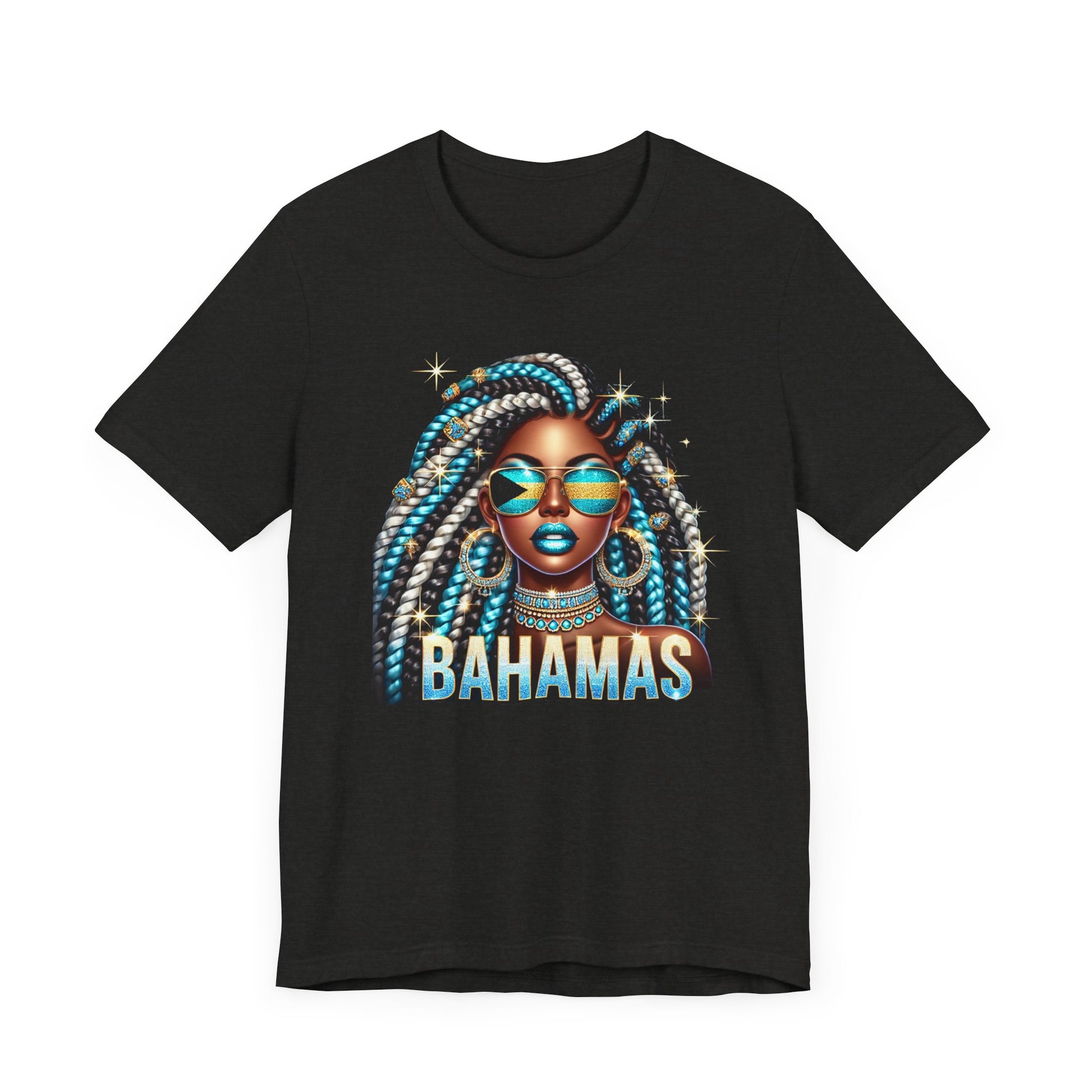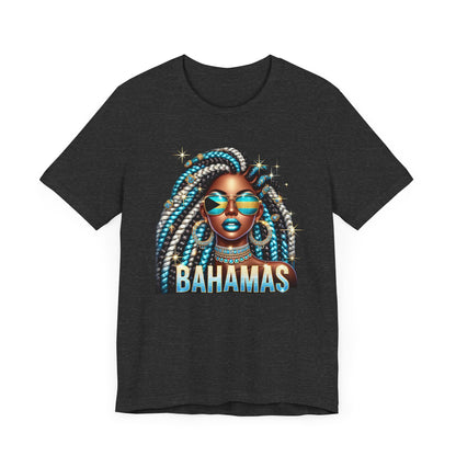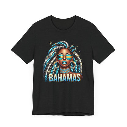Showcase your heritage with our Bahamas Pride Afrocentric Graphic T-Shirt, a masterful fusion of modern style and cultural authenticity. This distinctive tee features a captivating design of a bold figure with elaborate braided hair accented by blue and white beads and stars, symbolizing the rich artistic heritage of the Bahamas. The prominent "BAHAMAS" lettering reinforces its message of island pride and serves as a hallmark of patriotic Bahamas apparel.