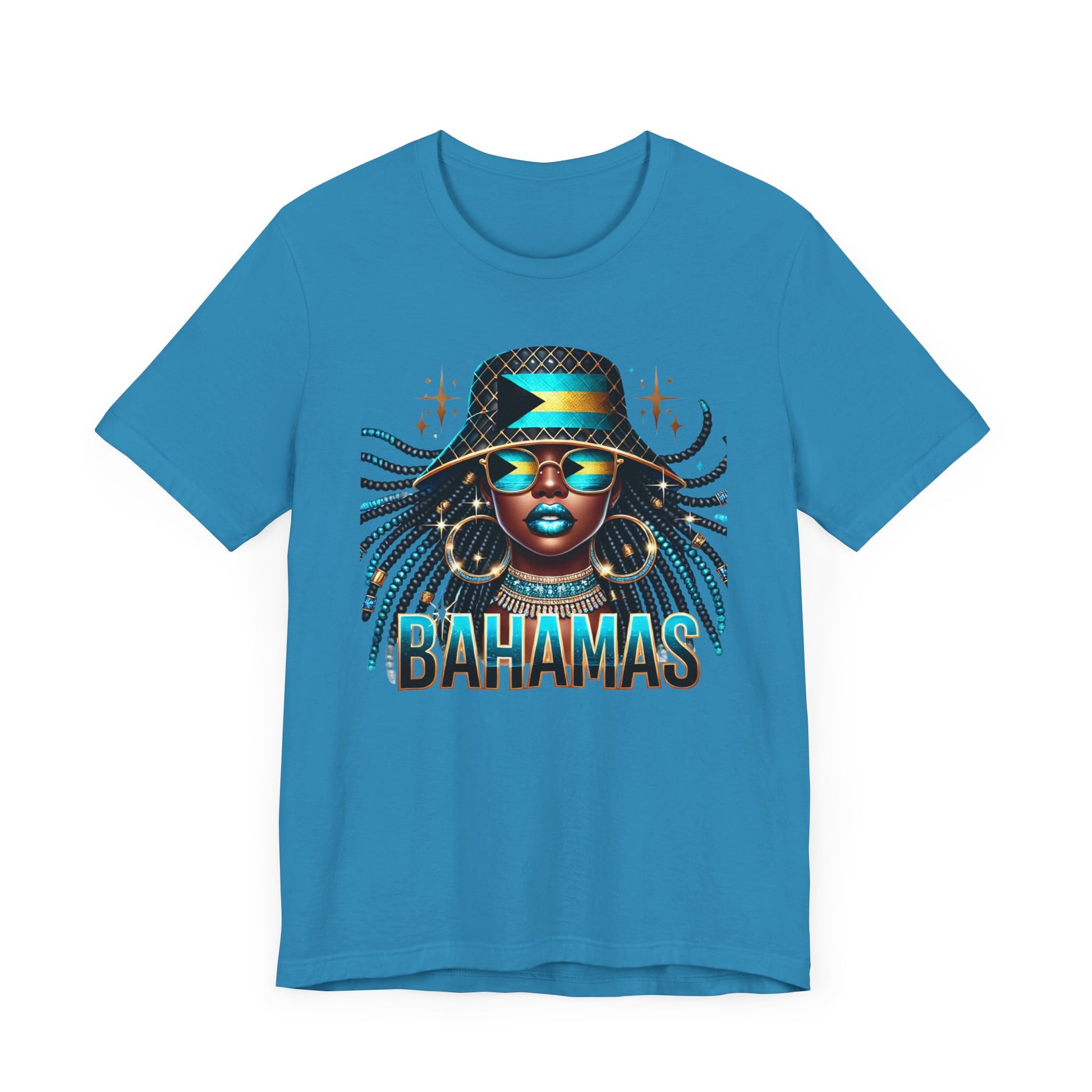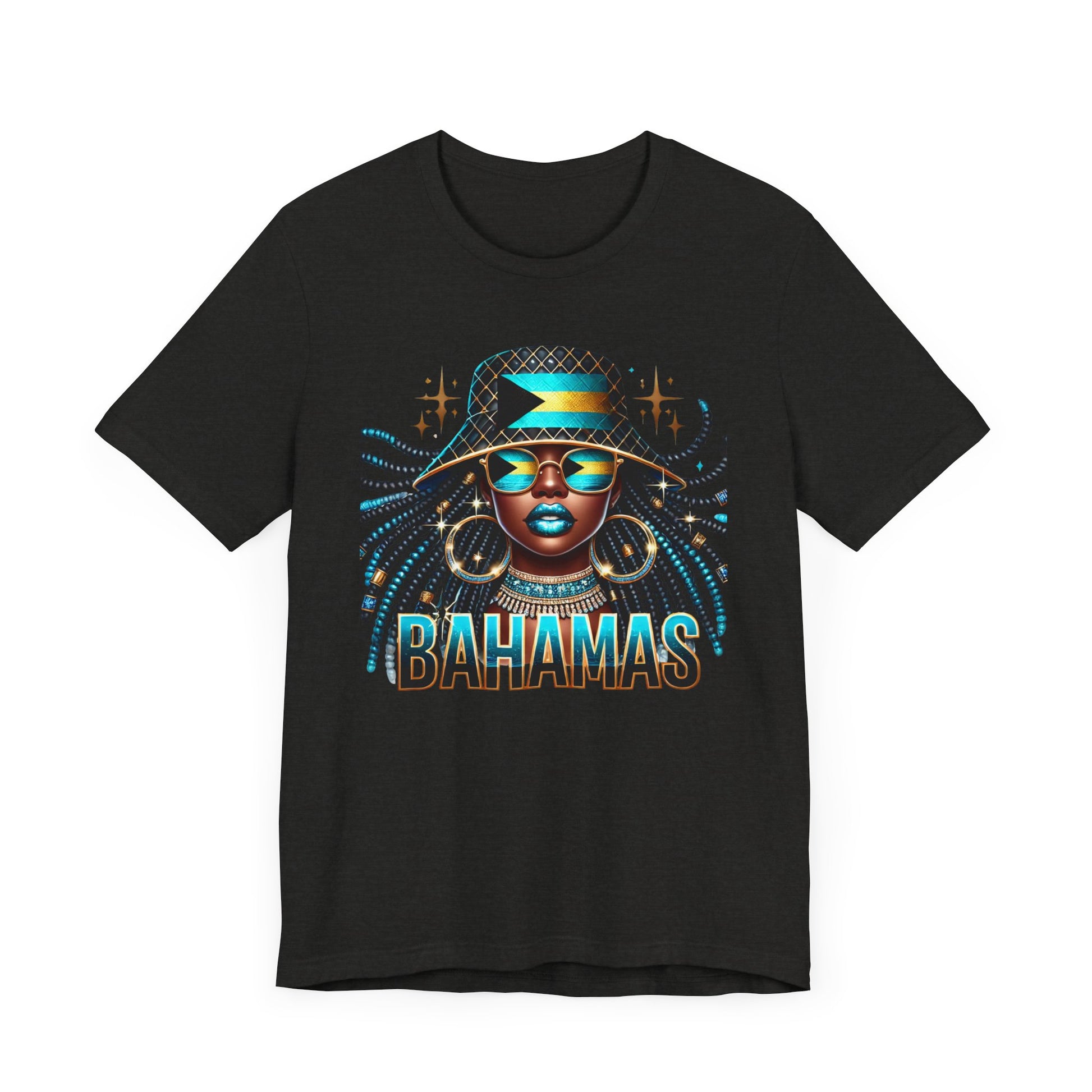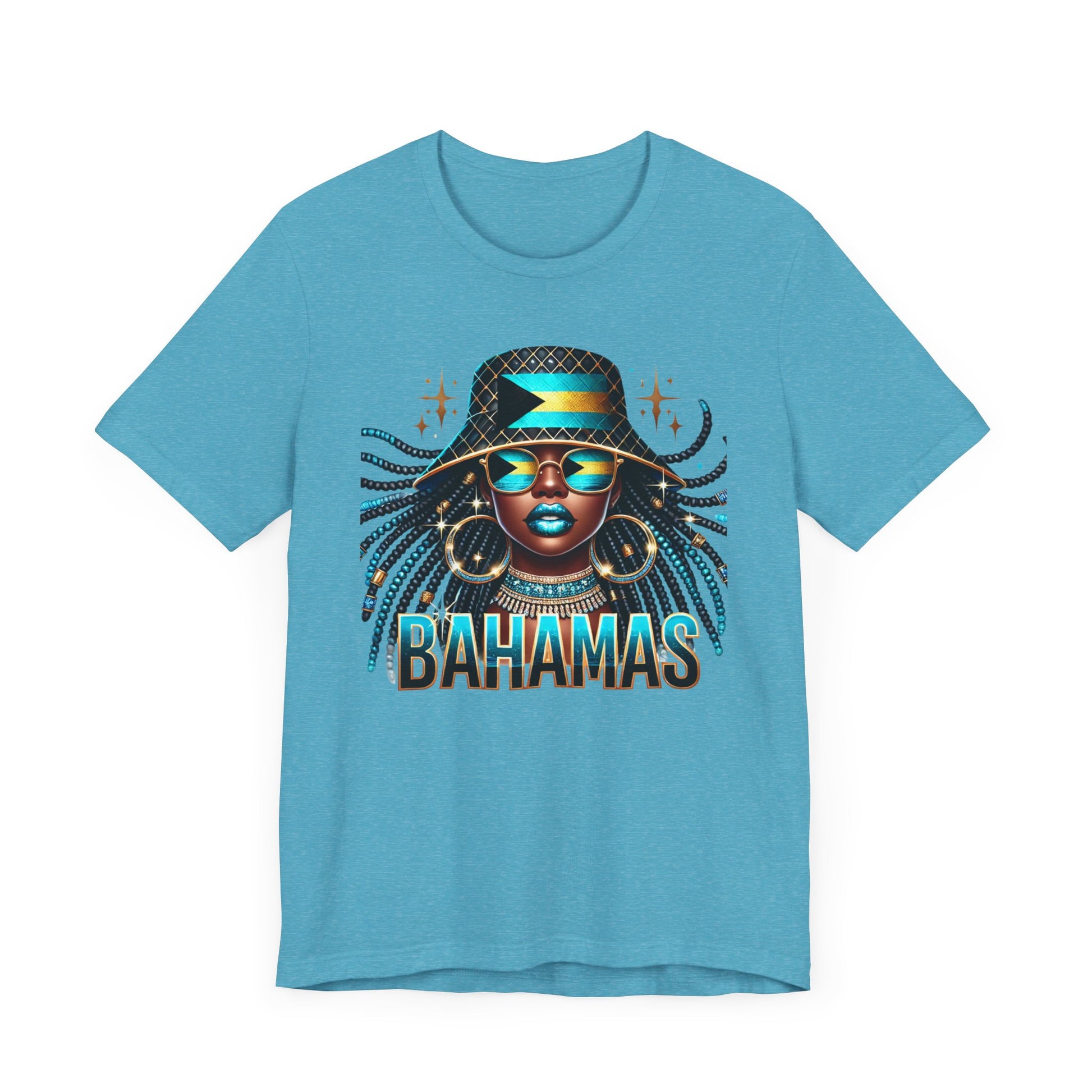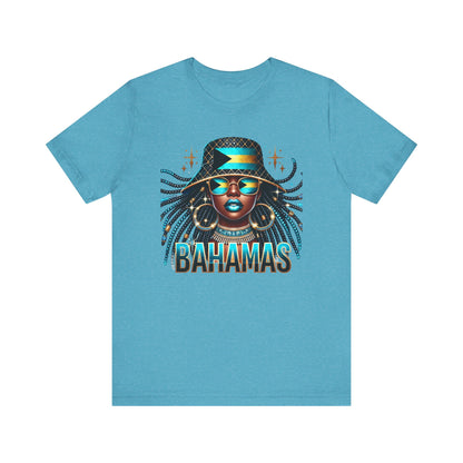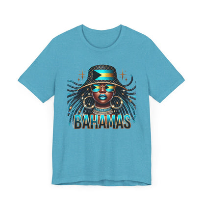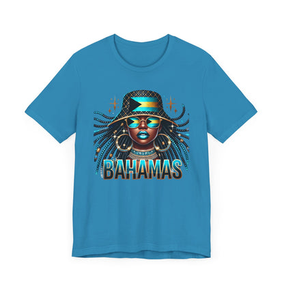Wear your Bahamian patriotism with pride with our Bahamas Pride Women's Graphic T-Shirt. This bold and inspiring design celebrates the resilience, unity, and rich culture of the Bahamas. At its heart is a striking graphic of a strong female figure wearing a cap adorned with the Bahamian flag, symbolizing unwavering national pride. The bold "BAHAMAS" lettering reflects your love for the islands and your commitment to honoring its heritage.