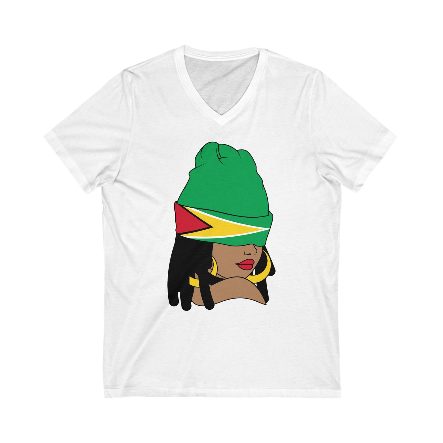 Elevate your wardrobe with the Women's Guyana Flag V-Neck Shirt, a stylish tribute to your heritage. Crafted with superior quality fabric, this shirt features the vibrant colors of the Guyana flag, embodying a sense of pride and elegance. Its flattering v-neck cut ensures a chic, comfortable fit perfect for any occasion, making it a must-have for those who wish to wear their cultural pride fashionably.