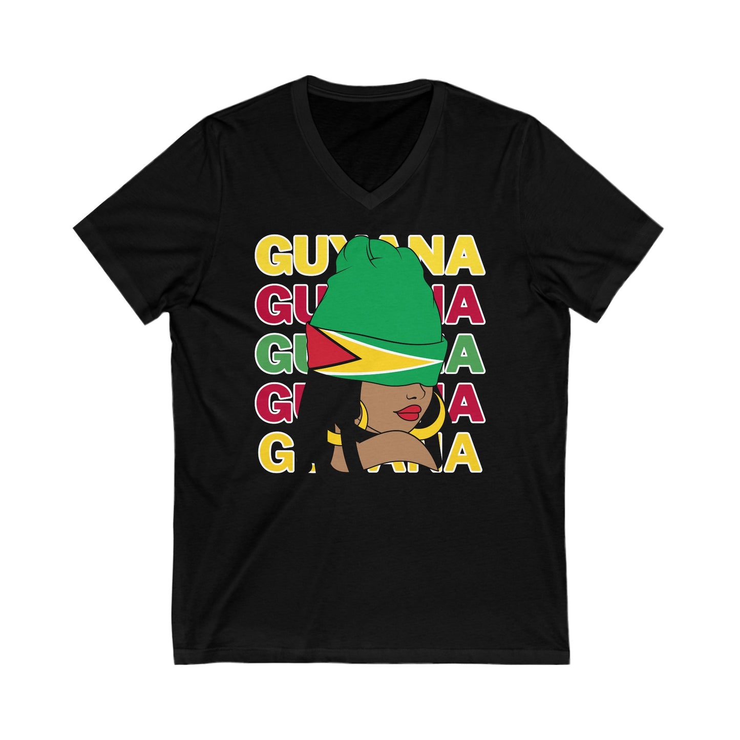 Elevate your wardrobe with the Women's Guyana Flag V-Neck Shirt, a stylish tribute to your heritage. Crafted with superior quality fabric, this shirt features the vibrant colors of the Guyana flag, embodying a sense of pride and elegance. Its flattering v-neck cut ensures a chic, comfortable fit perfect for any occasion, making it a must-have for those who wish to wear their cultural pride fashionably.