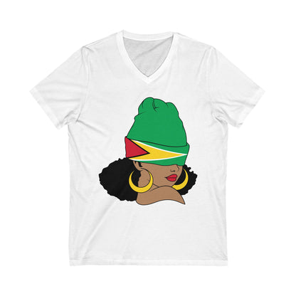 Elevate your wardrobe with the Women's Guyana Flag V-Neck Shirt, a stylish tribute to your heritage. Crafted with superior quality fabric, this shirt features the vibrant colors of the Guyana flag, embodying a sense of pride and elegance. Its flattering v-neck cut ensures a chic, comfortable fit perfect for any occasion, making it a must-have for those who wish to wear their cultural pride fashionably.