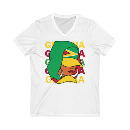 Elevate your wardrobe with the Women's Guyana Flag V-Neck Shirt, a stylish tribute to your heritage. Crafted with superior quality fabric, this shirt features the vibrant colors of the Guyana flag, embodying a sense of pride and elegance. Its flattering v-neck cut ensures a chic, comfortable fit perfect for any occasion, making it a must-have for those who wish to wear their cultural pride fashionably.