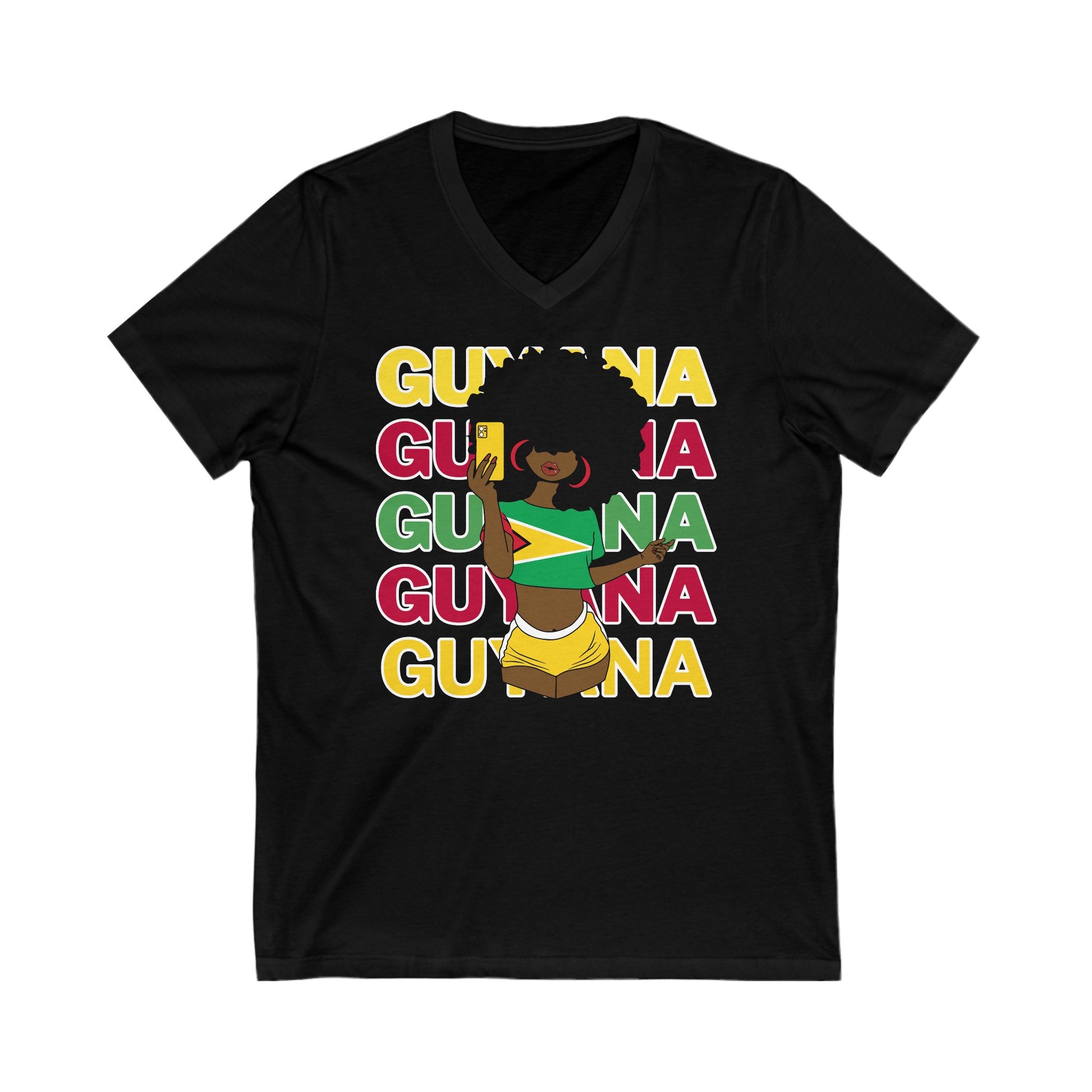 Elevate your wardrobe with the Women's Guyana Flag V-Neck Shirt, a stylish tribute to your heritage. Crafted with superior quality fabric, this shirt features the vibrant colors of the Guyana flag, embodying a sense of pride and elegance. Its flattering v-neck cut ensures a chic, comfortable fit perfect for any occasion, making it a must-have for those who wish to wear their cultural pride fashionably.