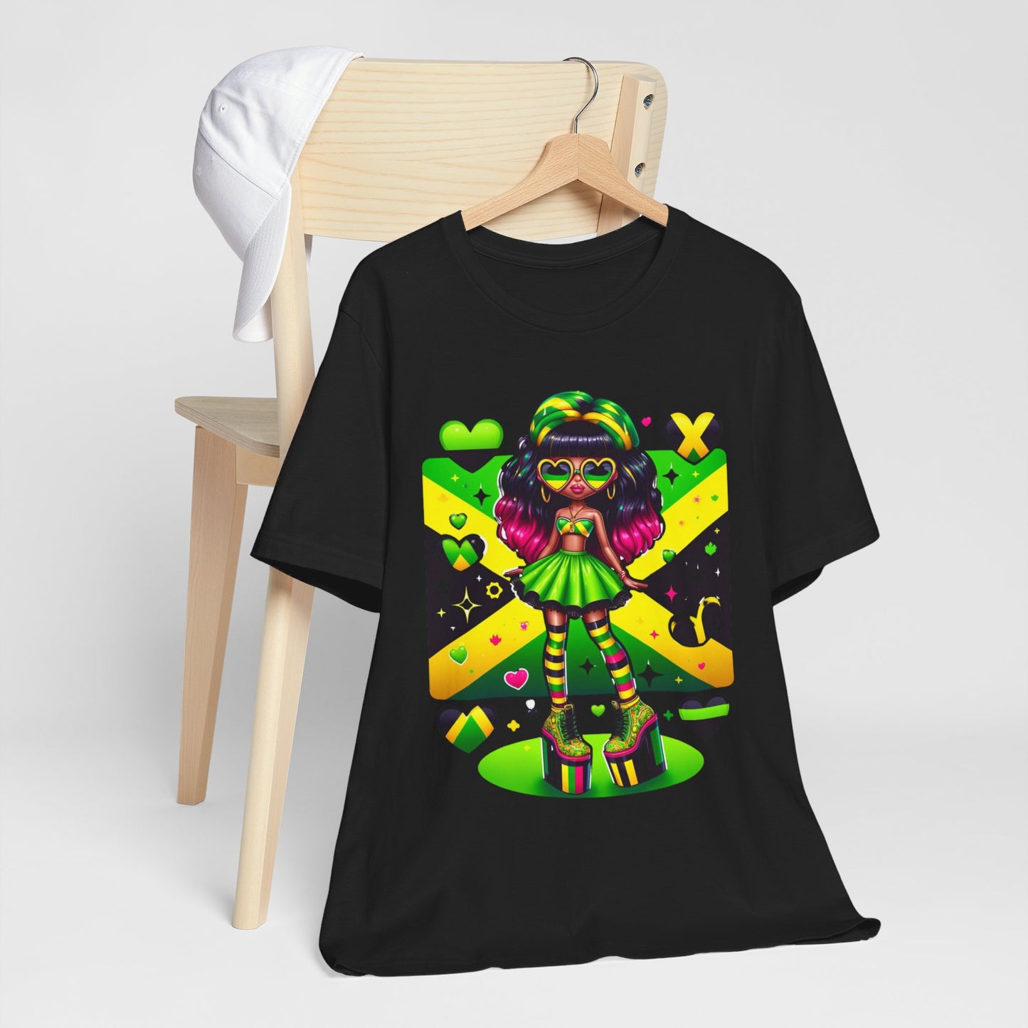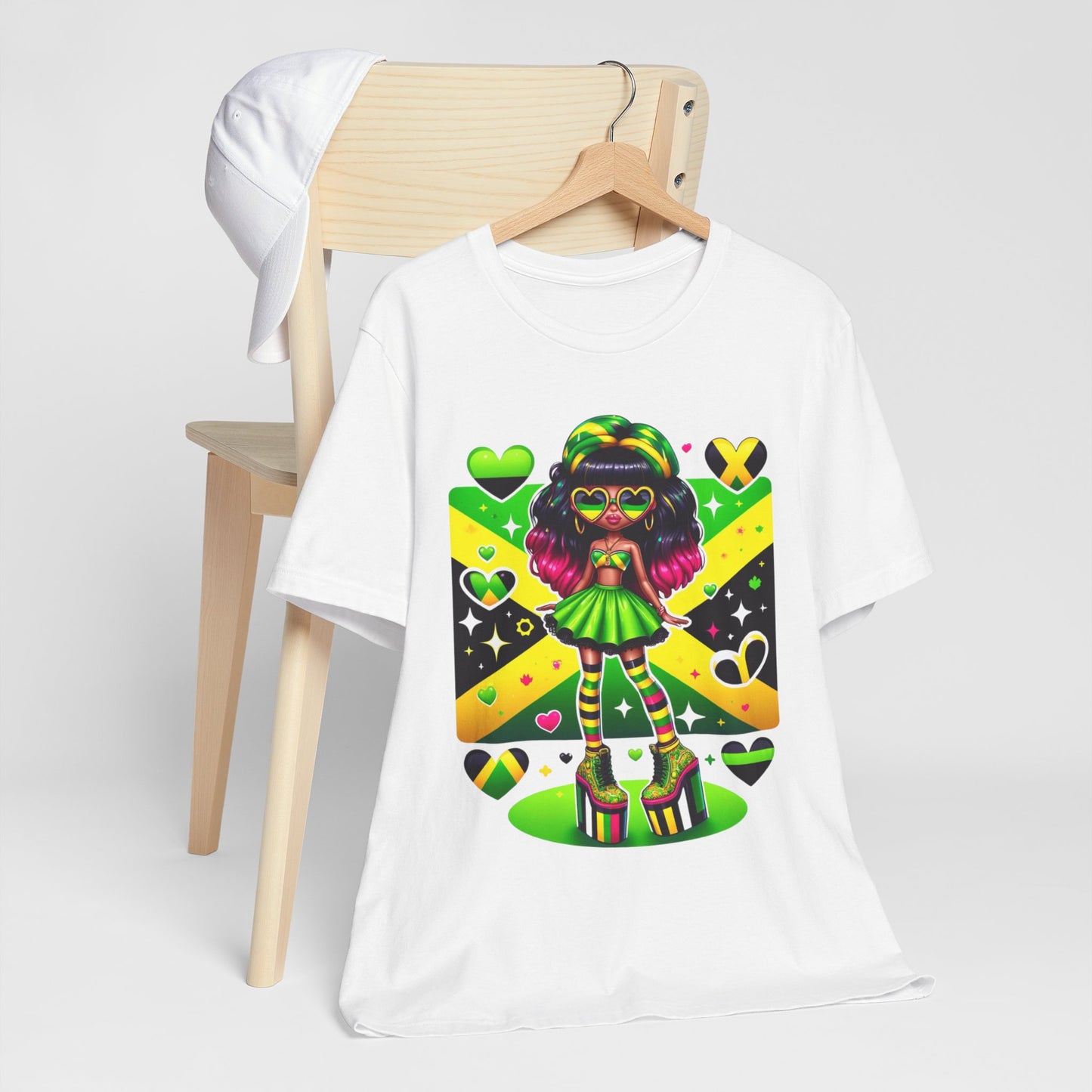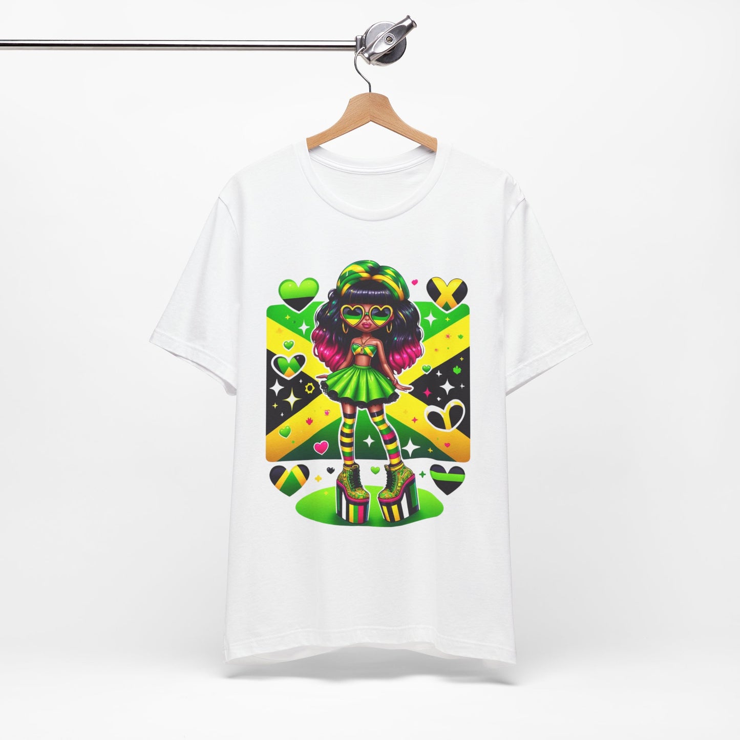 The striking colors of the Jamaican flag, infused with the iconic reggae vibes, make this tee a must-have for any Jamaican woman who wants to make a statement and honor her heritage. Whether you're at a cultural festival, supporting your favorite Jamaican athlete, or simply adding a touch of island style to your everyday look, this shirt is the perfect choice.